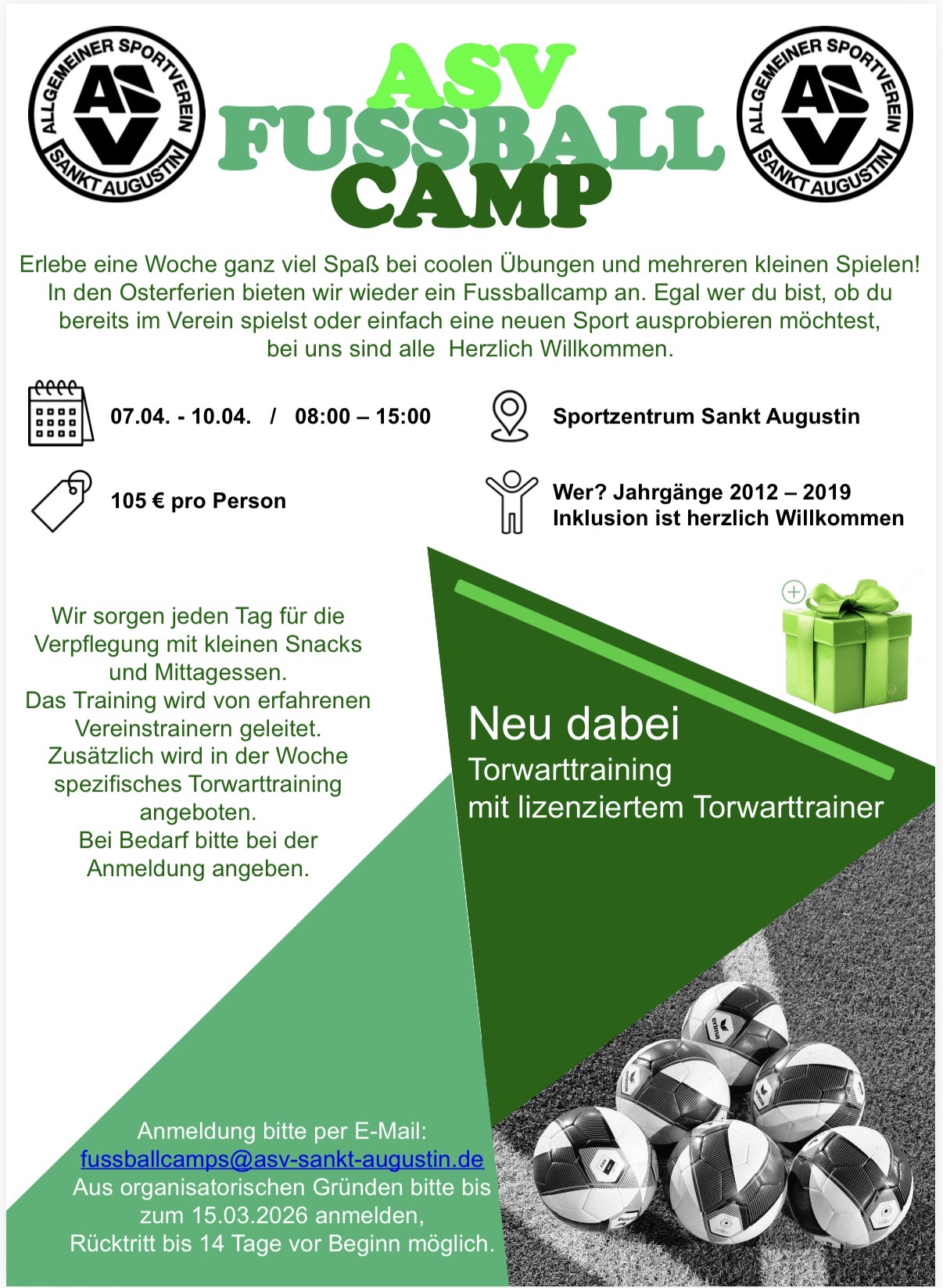 Fussball Ostercamp 2026 22. Februar 2026 Andreas Pätschinsky Fussball In der Woche 07.04. – 10.04. veranstaltet der ASV Sankt Augustin wieder sein beliebtes Fussball Camp. Screenshot